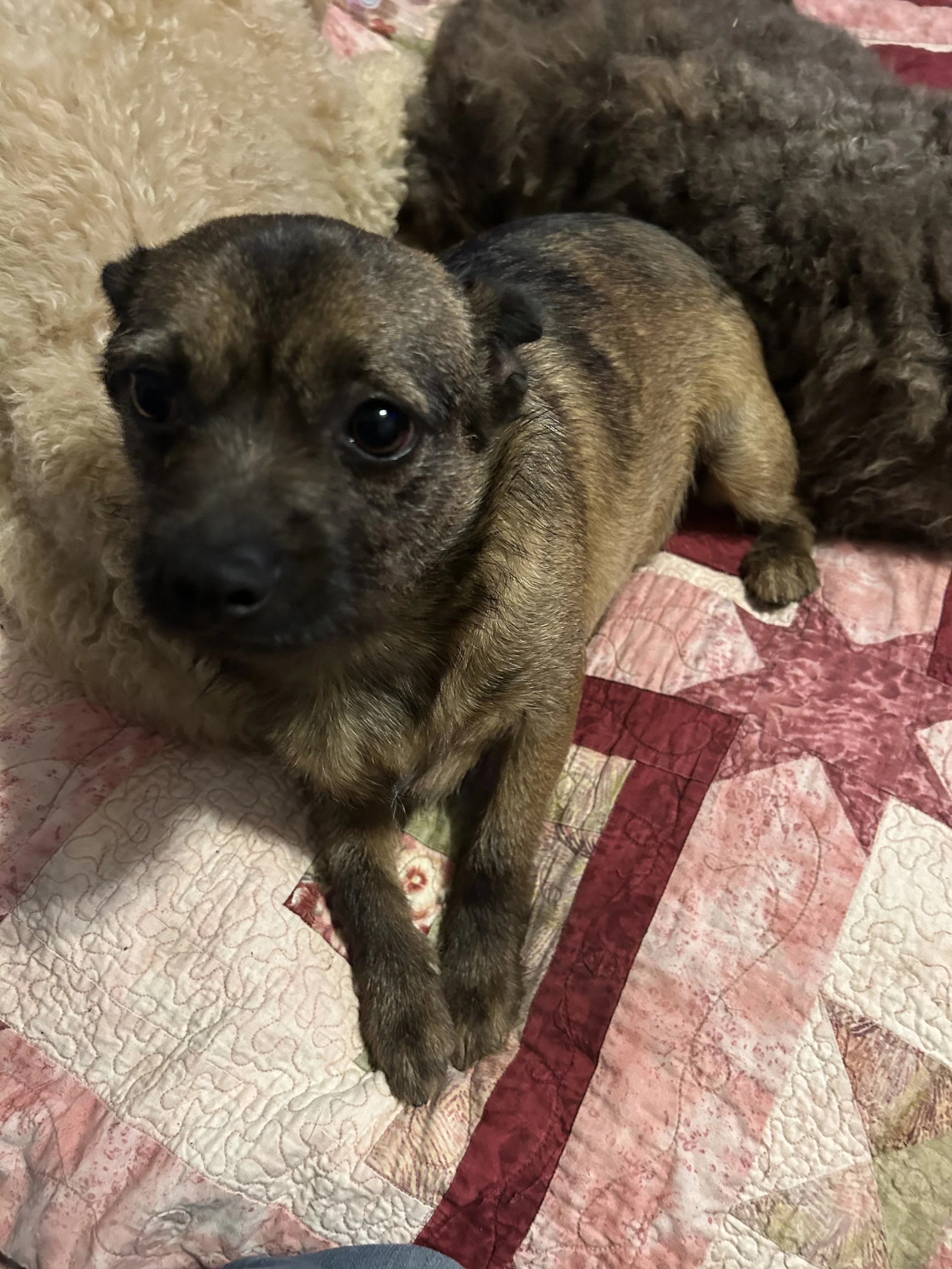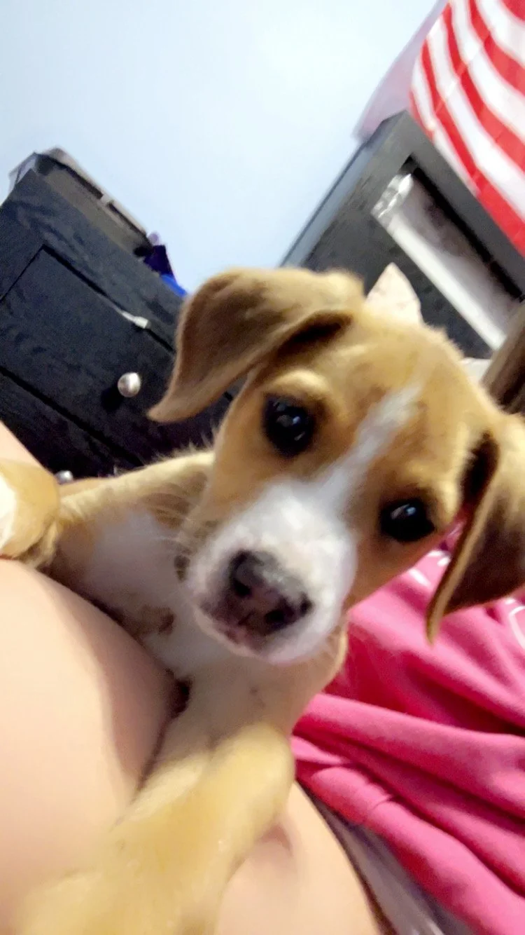 This sweet girl and her adoptive brother were left at an empty residence inside crates on the front porch. No food, no water. She was picked by animal control where we were able to pick her up after a neighbor had alerted us to the situation. She is up to date on vet care and will be microchipped.